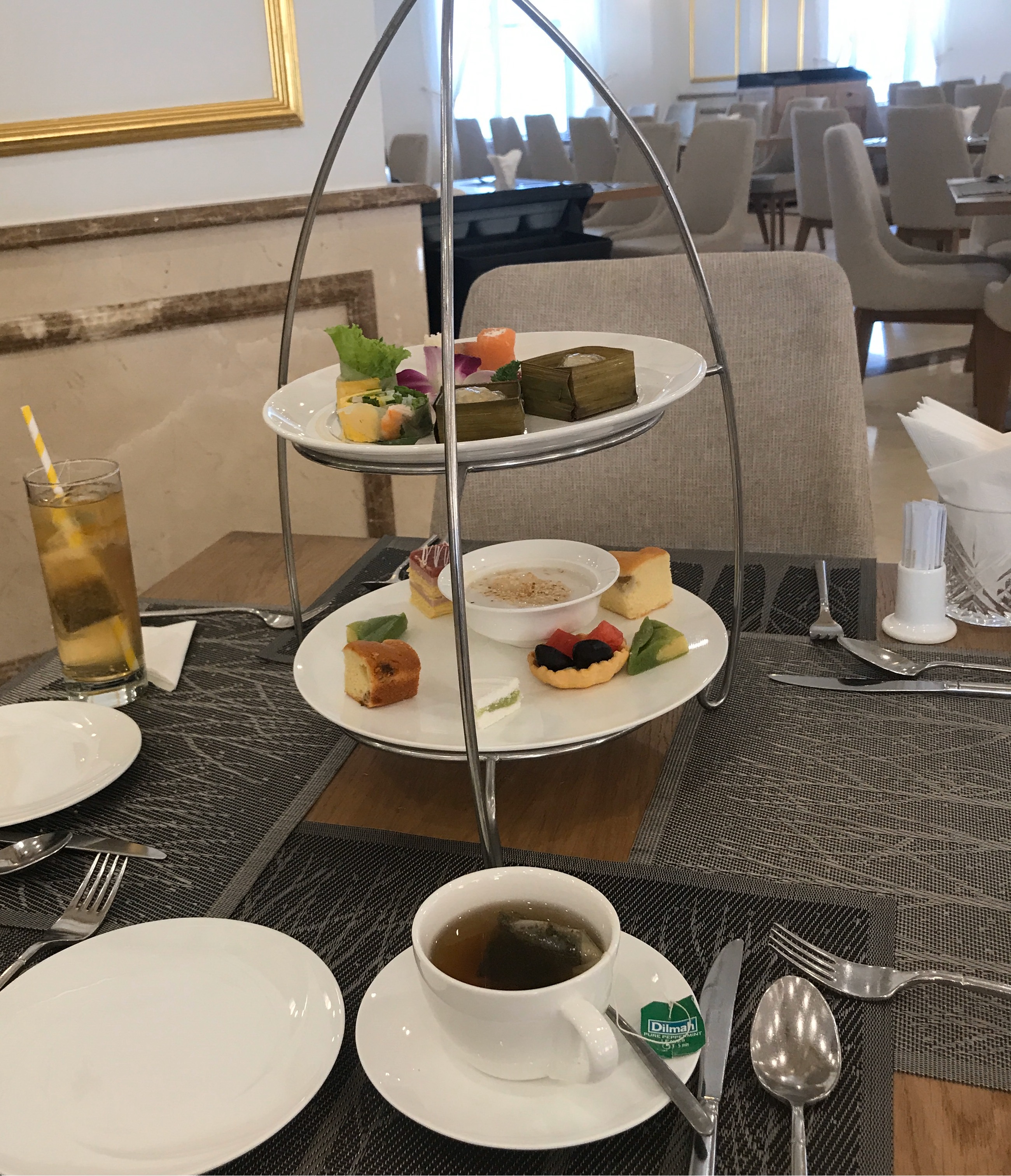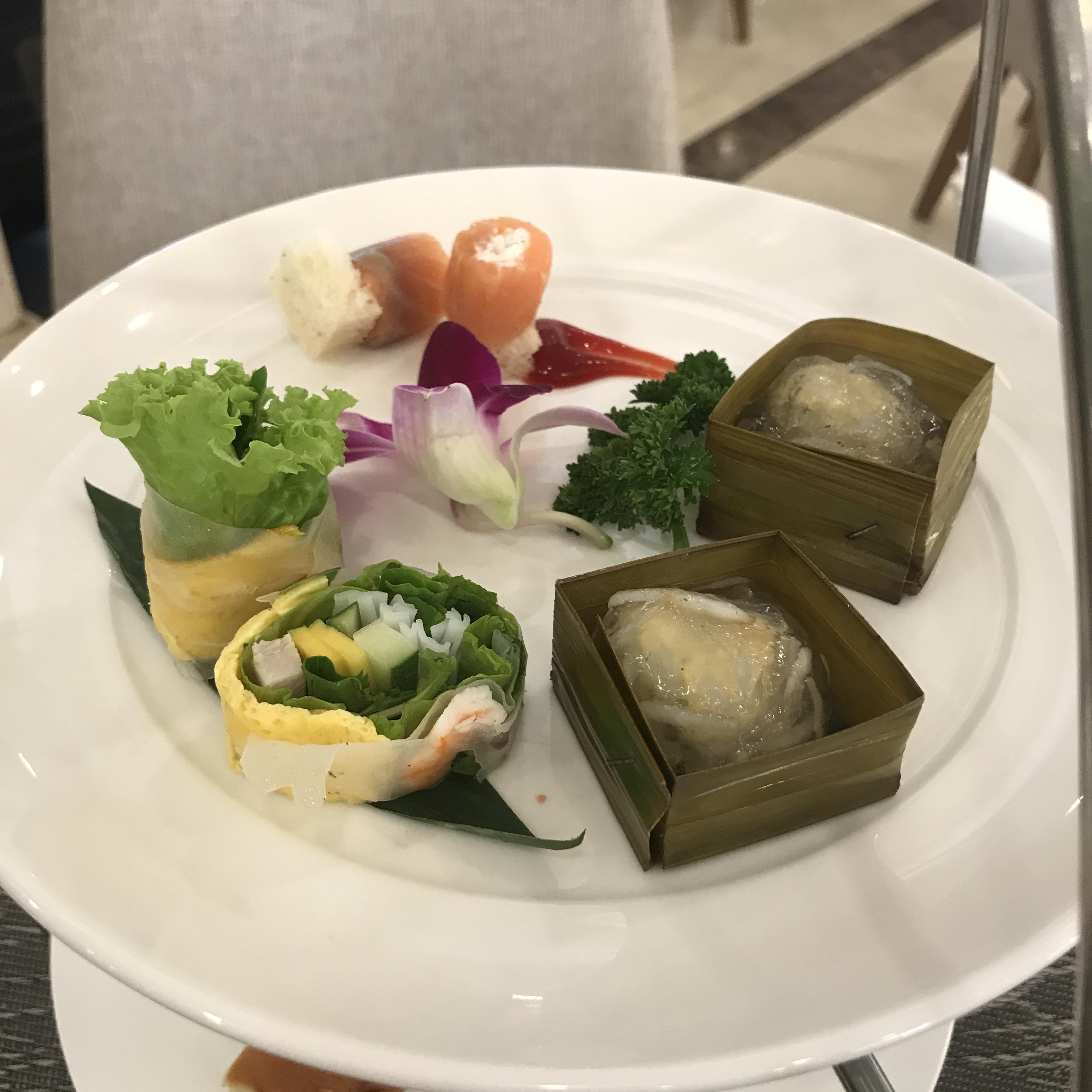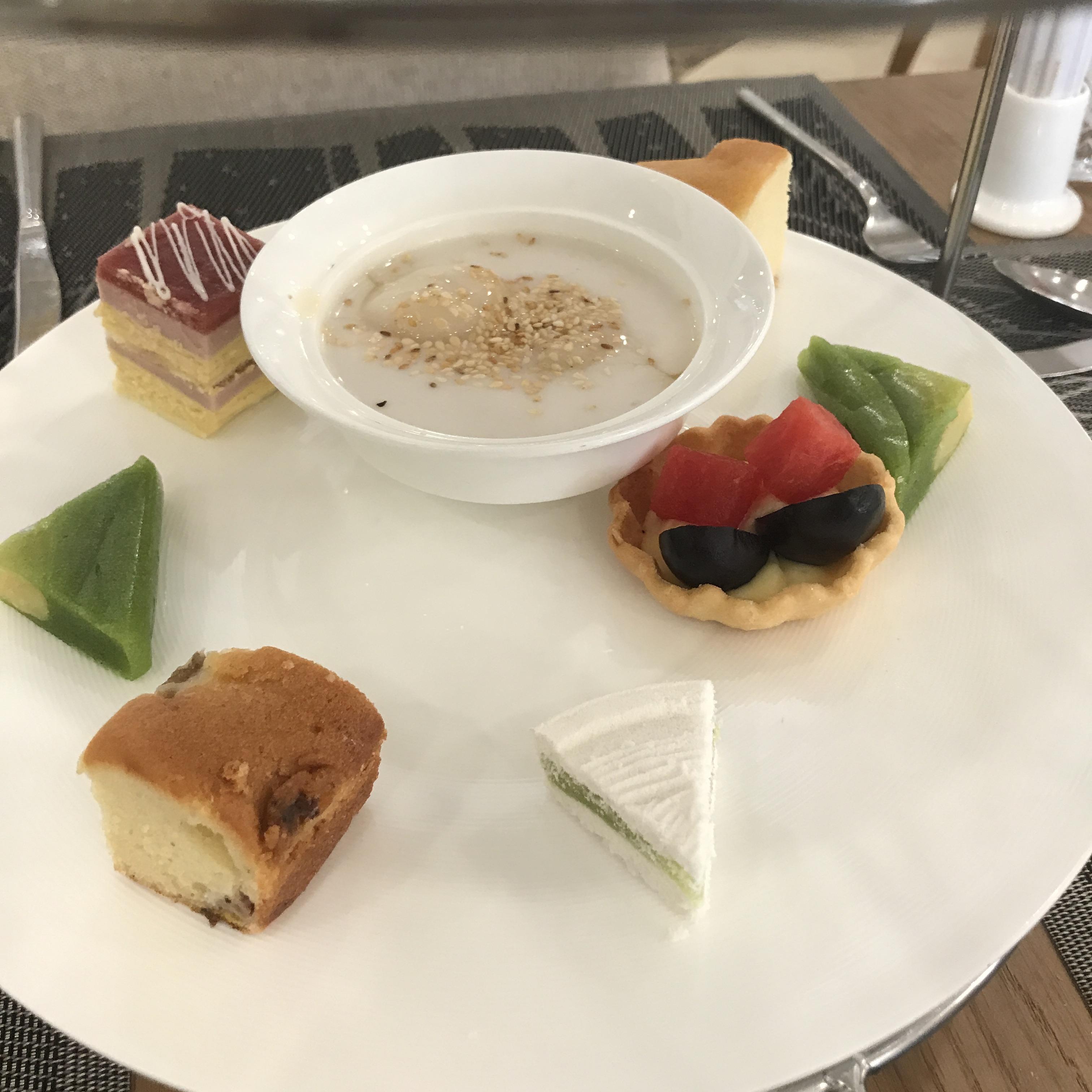 트레이 아래층에는 디저트들이 있다. 접시에 있는건 코코넛+꿀같이 달달한 무언가가 섞인 소스 안에, 찹쌀송편같은 것이 두 개 들어있었다. 익숙한 송편 속의 설탕맛! 나쁘진 않았다. 타르트도 평범했고 다 무난무난한 맛이었다. 좋지도 나쁘지도 않았던 구성!!!