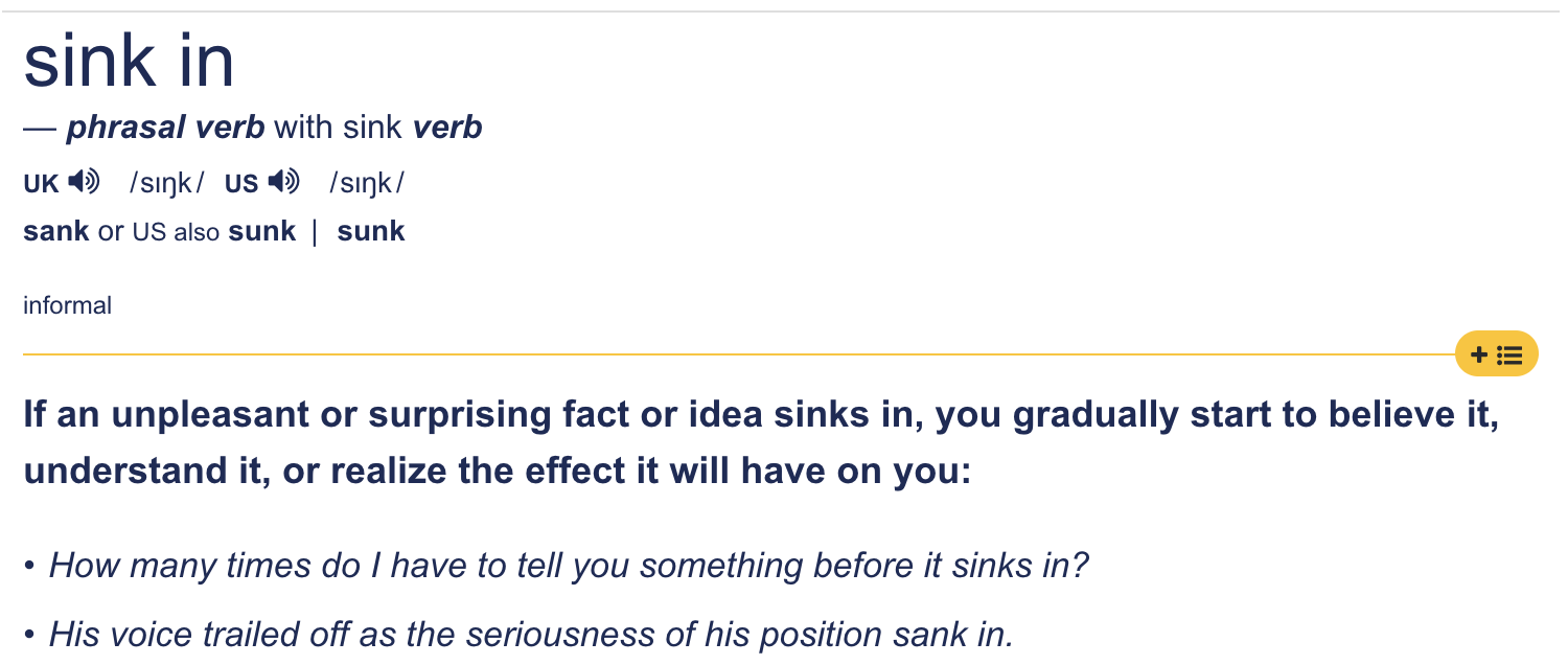 어떤 사실을 한번에 받아들이는것이 아니라 점차적으로 받아들일때, sink in의 주체가 그 "사실" 인 경우가 많은 것 같다 위의 예문에서 보듯이. 이해의 바다속으로 점점 가라앉게되는 그런 그림을 생각하면 되는 것 같다.