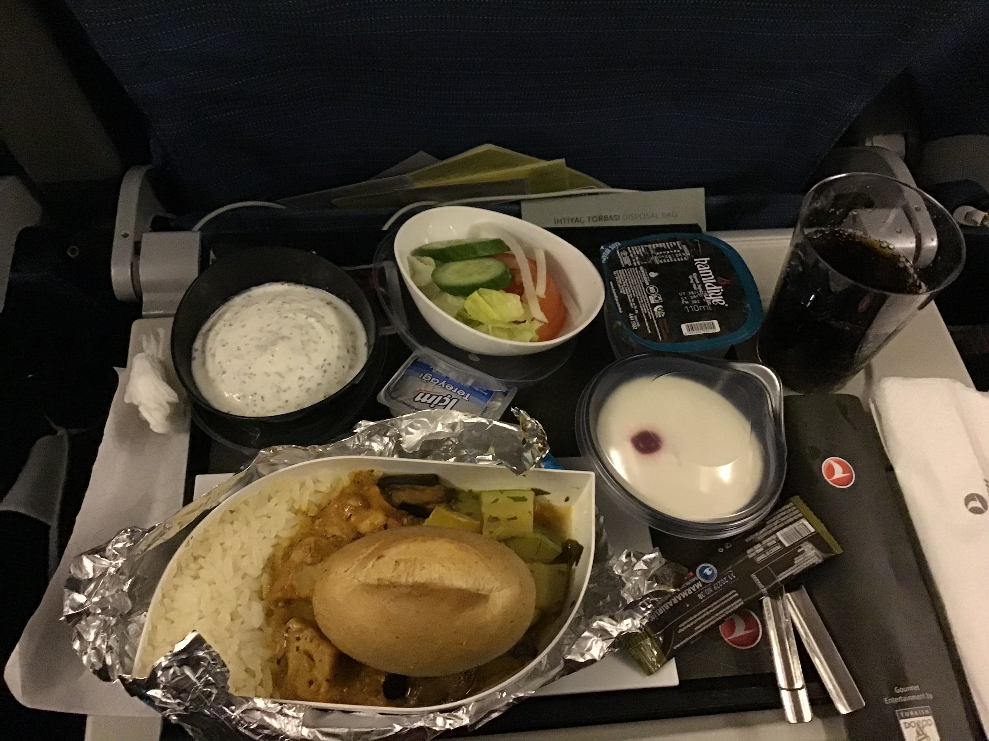 드디어 비행기에 탑승 후 식사. 요거트와 샐러드, 따끈따끈한 빵과 치킨과 밥. 터키항공에서는 드레싱을 항상 주는데 레몬과 올리브유가 있는 드레싱이다. 샐러드랑 같이 먹어도 좋겠지만 빵에 찍어먹으면 너무 맛있다. 이 드레싱만 잔뜩 챙겨가고싶었다. 그리고 터키항공에는 코카콜라가 아닌 펩시를 제공한다.