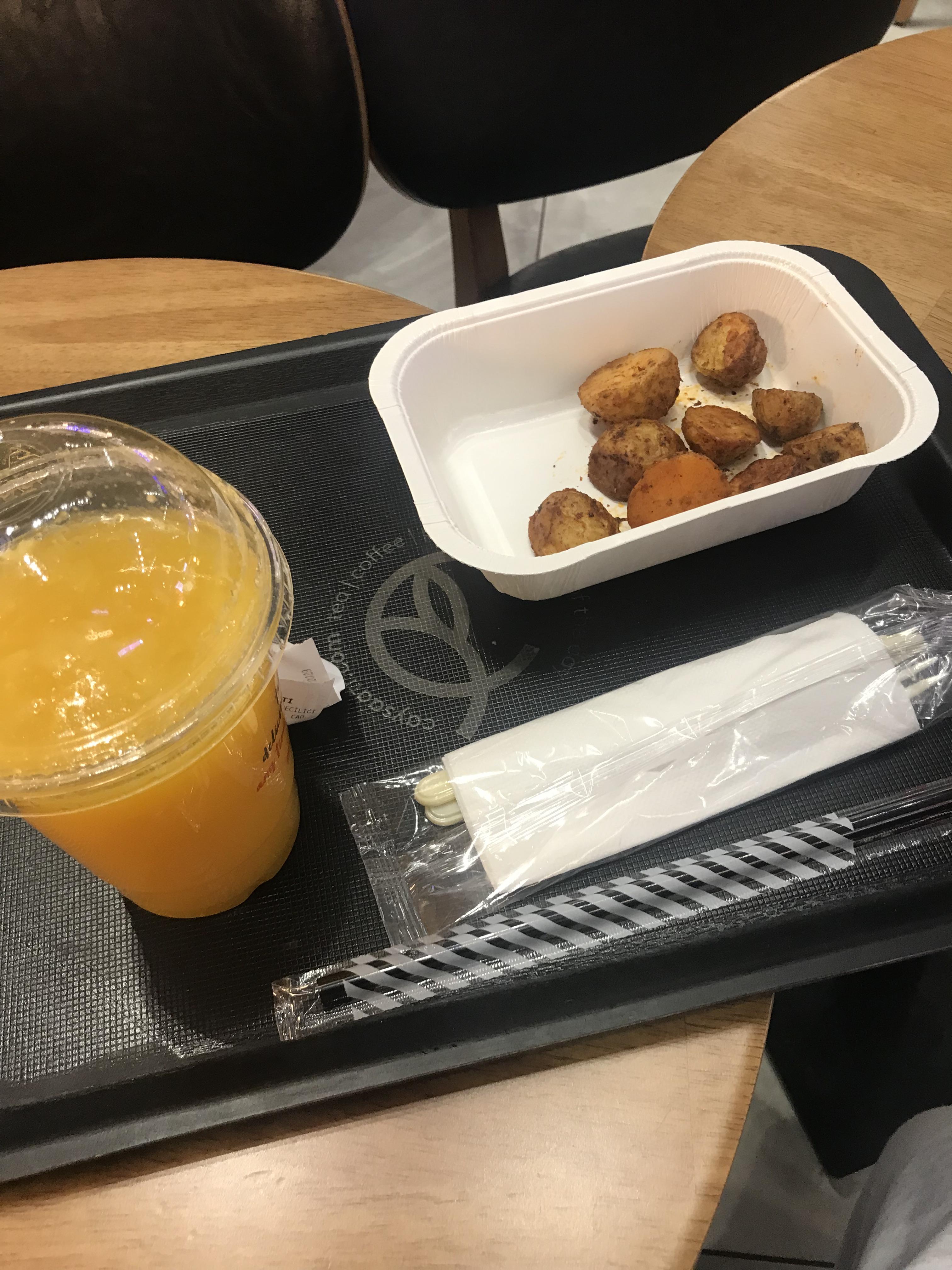 공항 가운데 가장 붐볐던 카페가 밤이되자 좀 널널해지길래 이곳에서 오렌지주스와 미니 감자를 사서 배를 채웠다. 오렌지주스를 굳이 고른 이유는 생 오렌지를 직접 갈아서 만드는 기계가 카페 한가운데 있었는데 너무 신선해보여서였다. 그냥 오렌지 즙 짠 그 신선한 맛이다. 시중의 오렌지주스에서는 먹을 수 없는 그 맛! 비타민 보충을 하고 감자도 반 스쿱 사서 맛있게 비웠다. 이렇게 사서 한화로 7천원 정도 결제되었다.
