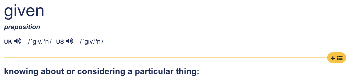가끔 까다로운 단어를 만난다. given 이 그 대표적인 예이다. 분사형으로 사용되는데, 이렇게도 쓰이고 저렇게도 쓰이고, 마주치면 어떻게 해석해야할지 감이 안 잡힐 때도 있다. 캠브릿지 사전을 훑어보면서 이 단어를 공략해보도록 하자.