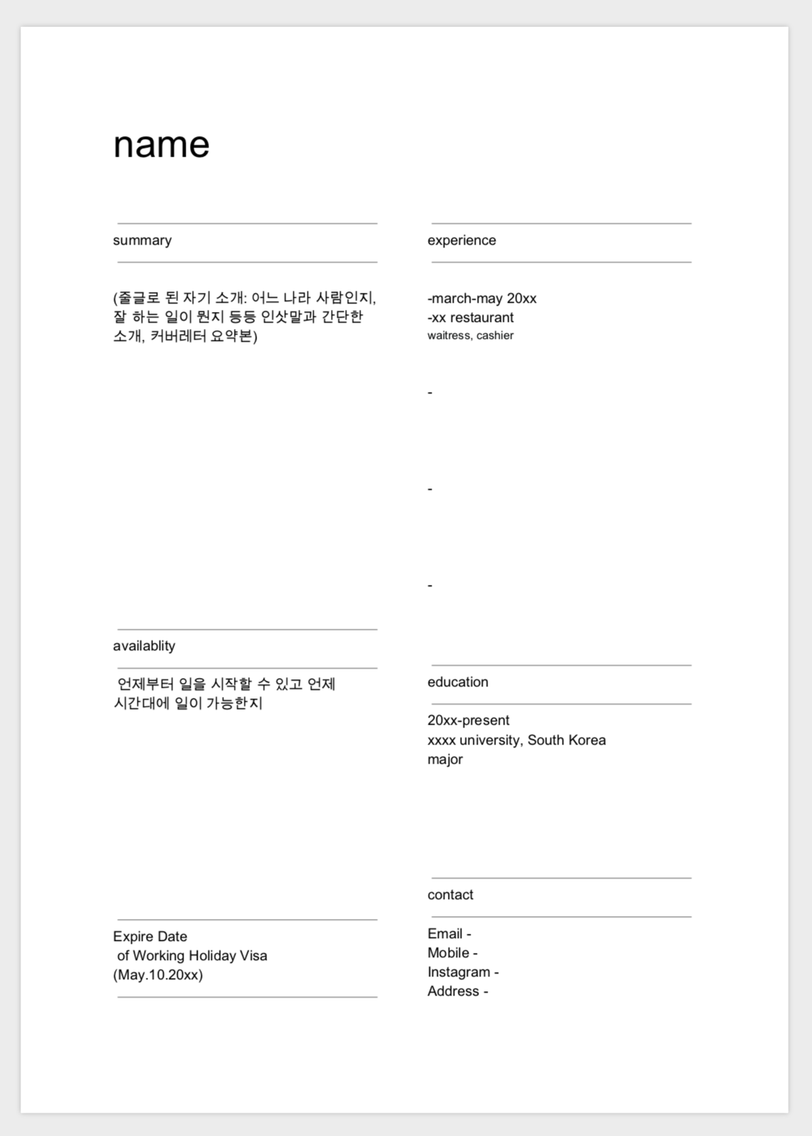 내가 오지잡을 어떻게 구했는지, 처음 워홀 시작했을때의 막막함이 얼마나 큰 지 알기에 혹시 도움이 될 까 하여 이력서 작성에 대한 포스팅을 하려고 한다. 이력서를 한 10군데 좀 넘게 돌린 것 같다. 하지만 초반에 그냥 레주메를 전달하는 방식으로는 전혀 연락이 오지 않았고, 이력서를 한번 갈아엎고 나서 돌리자 마자 그 다음 날 바로 전화가 왔다. 한군데에서. 그리고 거기서 일 하고 있음...