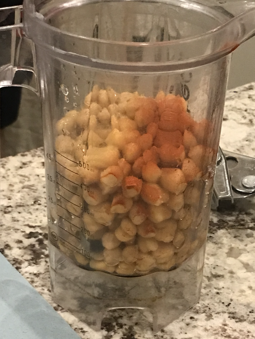 블렌더나 믹서에 불려져서 부드러운 병아리콩을 넣고 레몬즙, 다진 마늘 조금 (테이블 스푼 1스푼)을 넣어주면 되는데요, 저는 올리브 오일도 한 스푼 넣고 매콤한 맛을 약간 추가해보면 어떨까 해서 고춧가루도 약간 ㅎㅎ 추가했답니다.