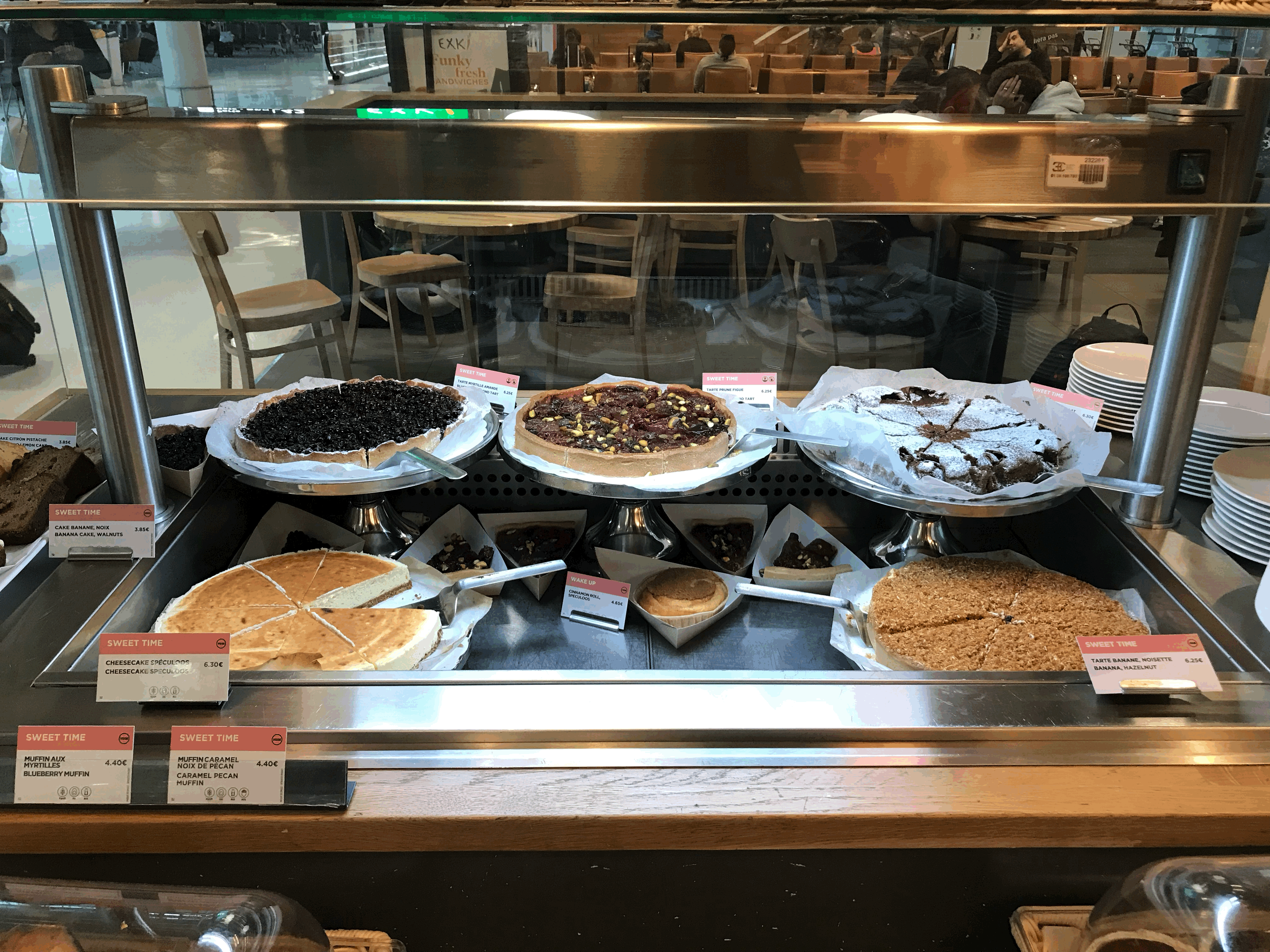 사실 마카롱이나 크로와상, 빵 오 쇼콜라, 스프, 샌드위치 등등은 어딜 가나 한국에서도 쉽게 찾을 수 있는데 이런 종류의 파이는 그렇게 흔하지 않은 것 같다. 이 와중에 내 눈길을 사로잡은 것은 오른쪽에 있는 바나나 헤이즐넛 파이... 6유로를 넘는 가격이었지만 도전해볼만한 가치가 있다 판단하여 과감히 한 조각을 덜어서 계산대로 가져갔다. (블루베리 처돌이로서 블루베리파이와 바나나 파이 사이에서 심히 고민했다)