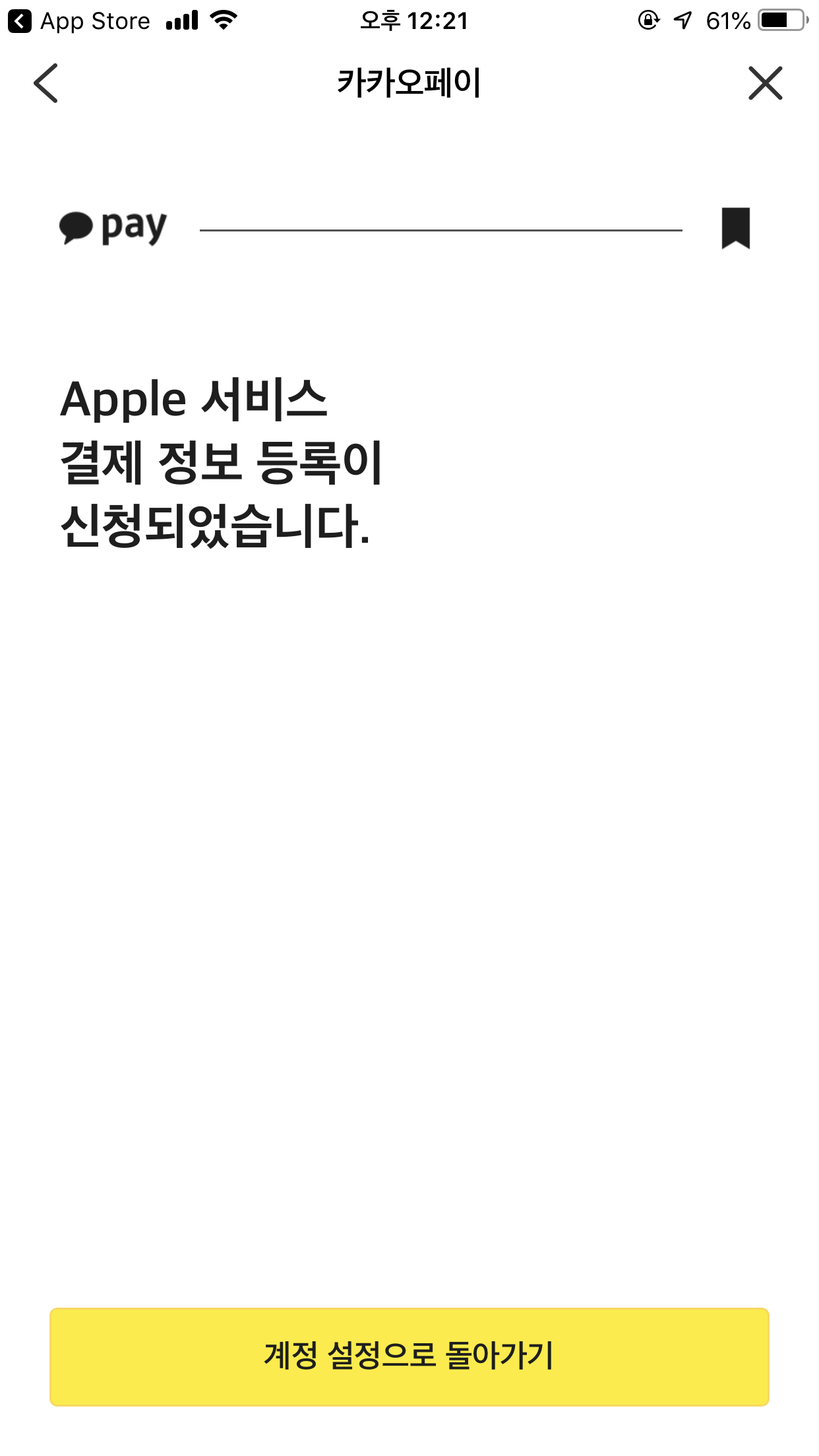 그러면 카카오톡이 열리면서 카카오페이 애플 서비스 등록 페이지가 뜬다. 간단한 비밀번호 입력하면 끝.