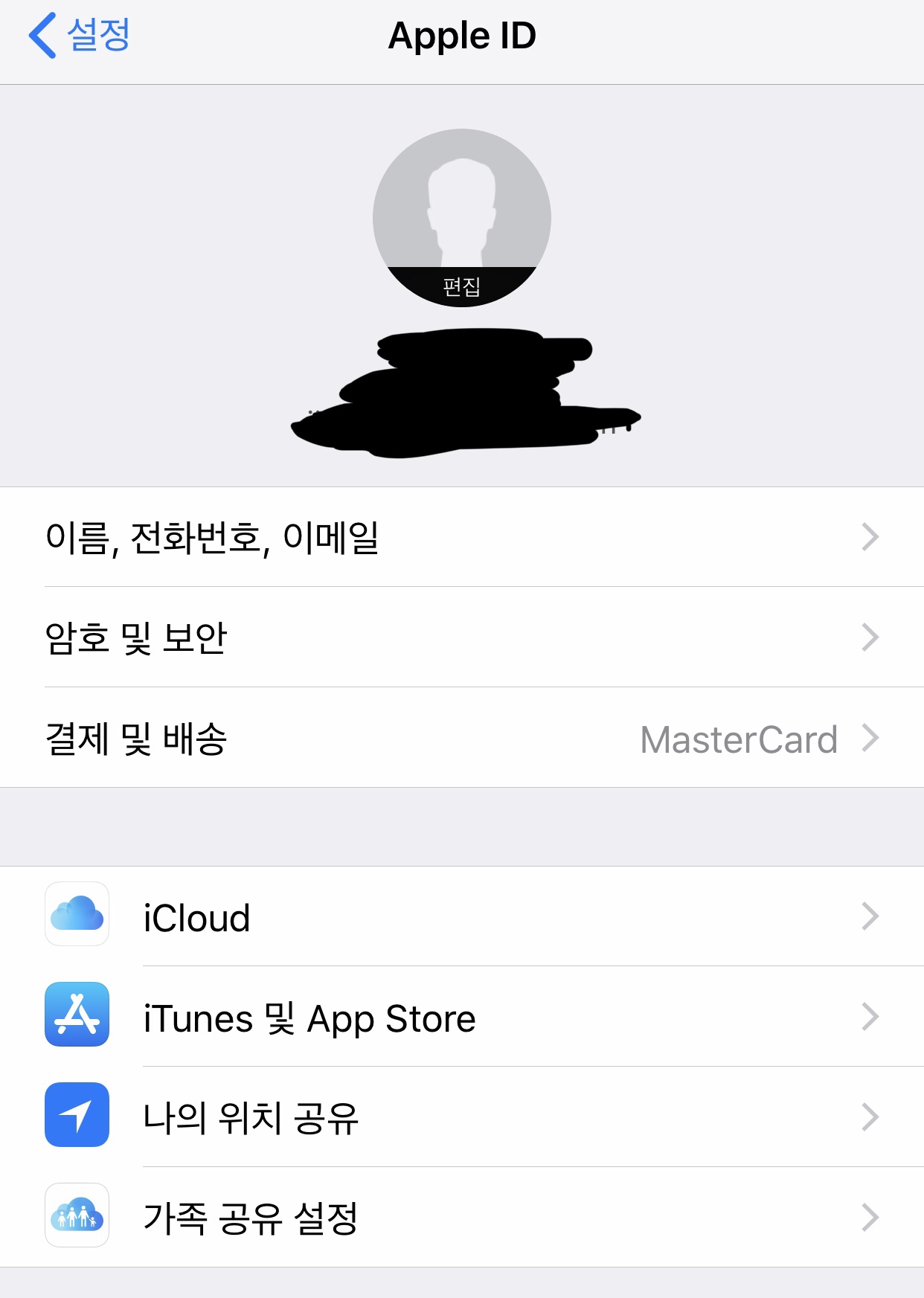 설정에 들어가서 내 애플 아이디를 터치한다. 그렇다면 내 아이클라우드 이메일과 "결제 및 배송" 섹션이 있다.