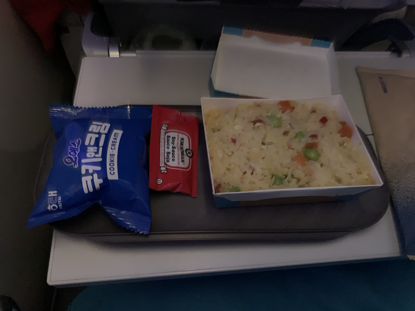 메뉴는 계란볶음밥 같은? 메뉴에 오예스 쿠키앤크림이 제공되었습니다. 캘거리에서 출발한 비행기인데 한국 오예스가 나오다니 신기했어요. 보통 출발지에서 쉽게 공수할 수 있는 간식을 줄 거 같은데 말이죠.