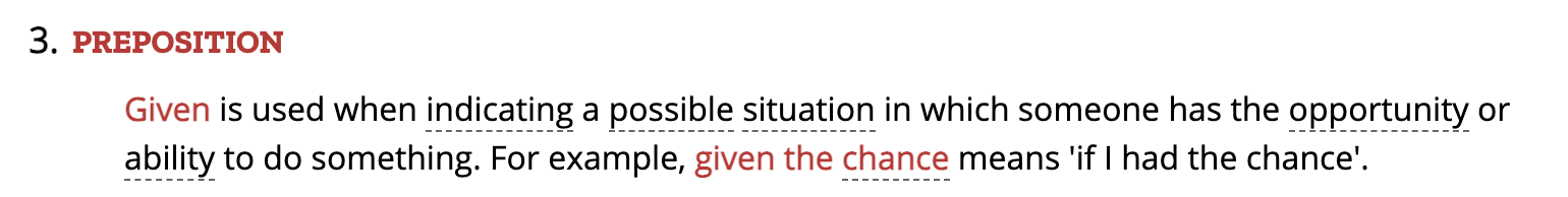 Given is used when indicating a possible situation in wich someone has the opportunity or ability to do something. 주어진, 고려하면 등 위에서 체크했던 의미와 연장선상에 있다는 느낌을 준다. given the chance 가 if I had the chance 로 해석된다고 한다.
