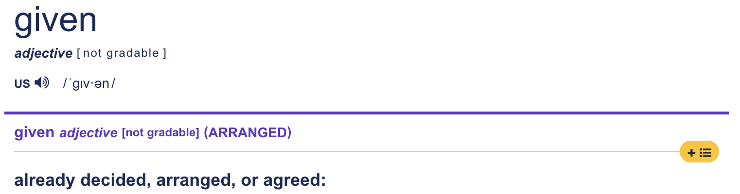 가끔 까다로운 단어를 만난다. given 이 그 대표적인 예이다. 분사형으로 사용되는데, 이렇게도 쓰이고 저렇게도 쓰이고, 마주치면 어떻게 해석해야할지 감이 안 잡힐 때도 있다. 캠브릿지 사전을 훑어보면서 이 단어를 공략해보도록 하자.