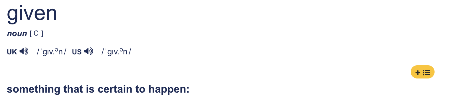 Something that is certain to happen. 명사로 쓰이는 given 이다. "as a given" 처럼 덩어리로 자주 쓰인다. "예정된 것, 당연한 것" 으로 해석하면 큰 무리 없을 것 같다.